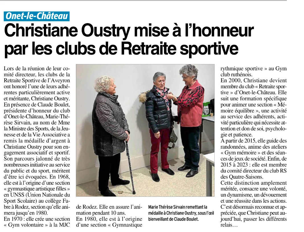 Mars 2025 Remise de médaille Christiane Oustry Article presse Jean C.